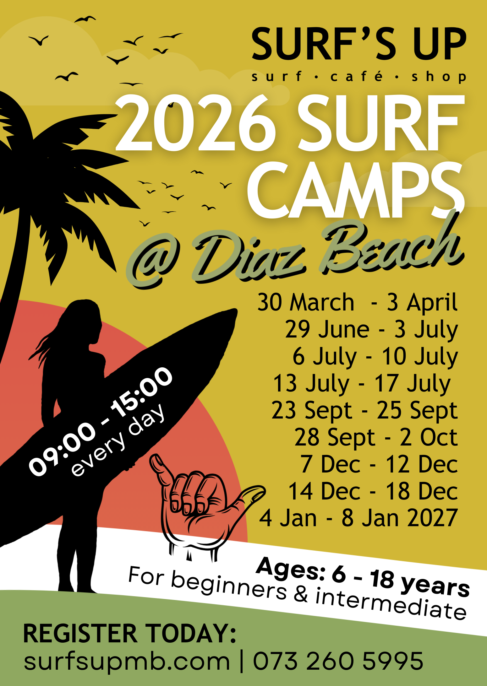 Whether you’re a beginner or an intermediate surfer looking to dial in your skills, our SURF CAMPS are where it’s at! Designed for ages 6 – 18, our camps are all about riding, learning, and having a blast at Diaz Beach, Mossel Bay!